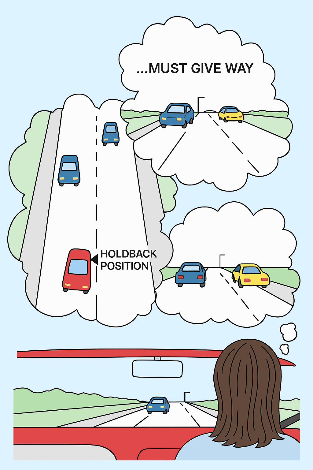 → Always know what’s behind — you might have a car following you closely.